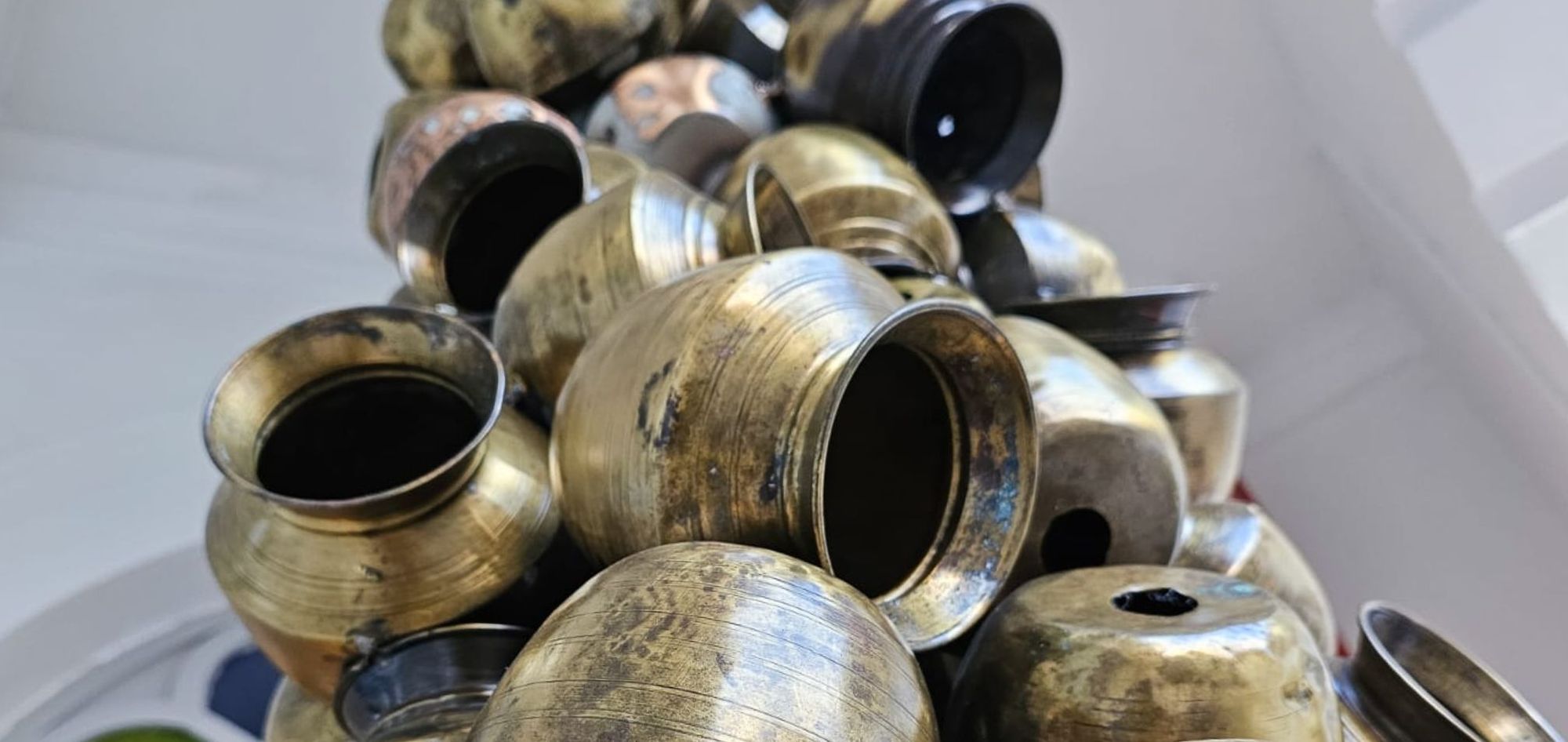 Like the turmeric used in Monument—an anti-inflammatory herb vital in Hindu rites for its purifying properties—Nahappan’s artistic practice is trademarked by her use of distinctly Southeast Asian symbols. In Anahata (2013-2023) we find a mountain of red saga seeds native to Southeast Asia, and in Reincarnations (360 Vessels from the temple) (1995/2022) we find winding towers of copper pots used in Hindu rituals. These works are testament of Nahappan’s ability to situate culturally-significant found objects within novel, yet meaningful contexts.