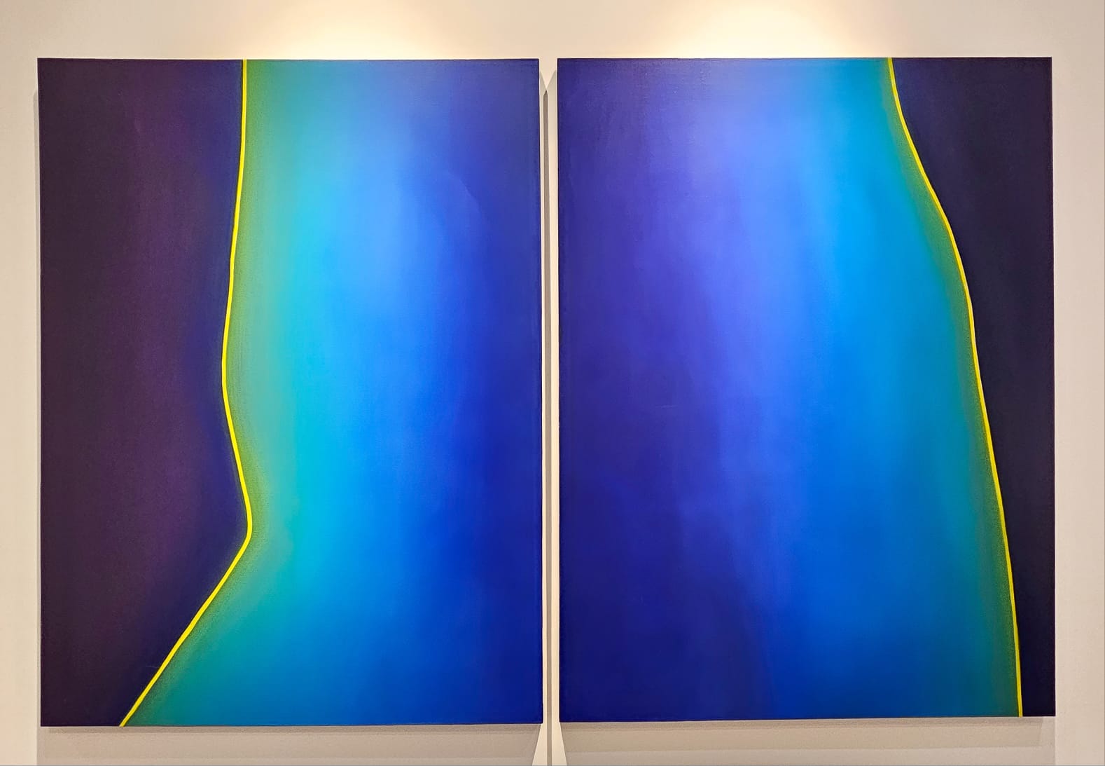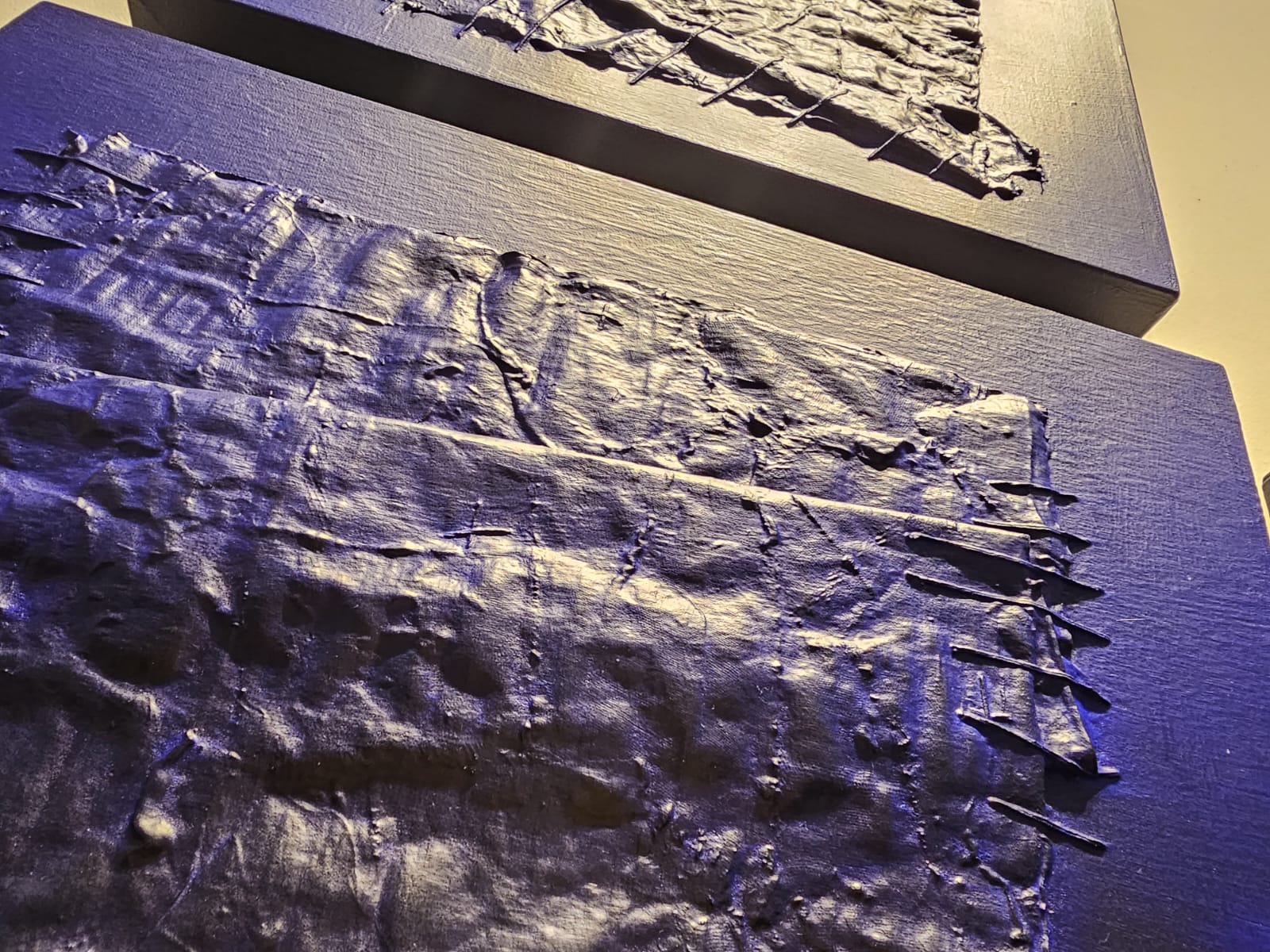 While we have been discussing Nahappan’s installations so far, Dancing with the Cosmos actually sees more of her paintings hung up than anything else. From Nahappan’s iconic colour field paintings showcasing her seamless blending and inquiry into hue, to her textural paintings tinged with her sculptural instincts, the exhibition invites viewers to explore a lesser-known aspect of Nahappan’s practice. Also on display in the blue room is Transcript: Reading Beyond (2015), a work commissioned for the Singapore Art Museum Exhibition, 5 Stars: Art Reflects on Peace, Justice, Equality, Democracy and Progress (2015). This abstract painting is an unconventional portrait of T.K. Sabapathy—a writer, curator, critic and illustrious pioneer of Singapore’s art history field. The triptych features calming gradients of blue and purple, intersected by a golden yellow streak that, through the means of blended paint, appears luminescent.