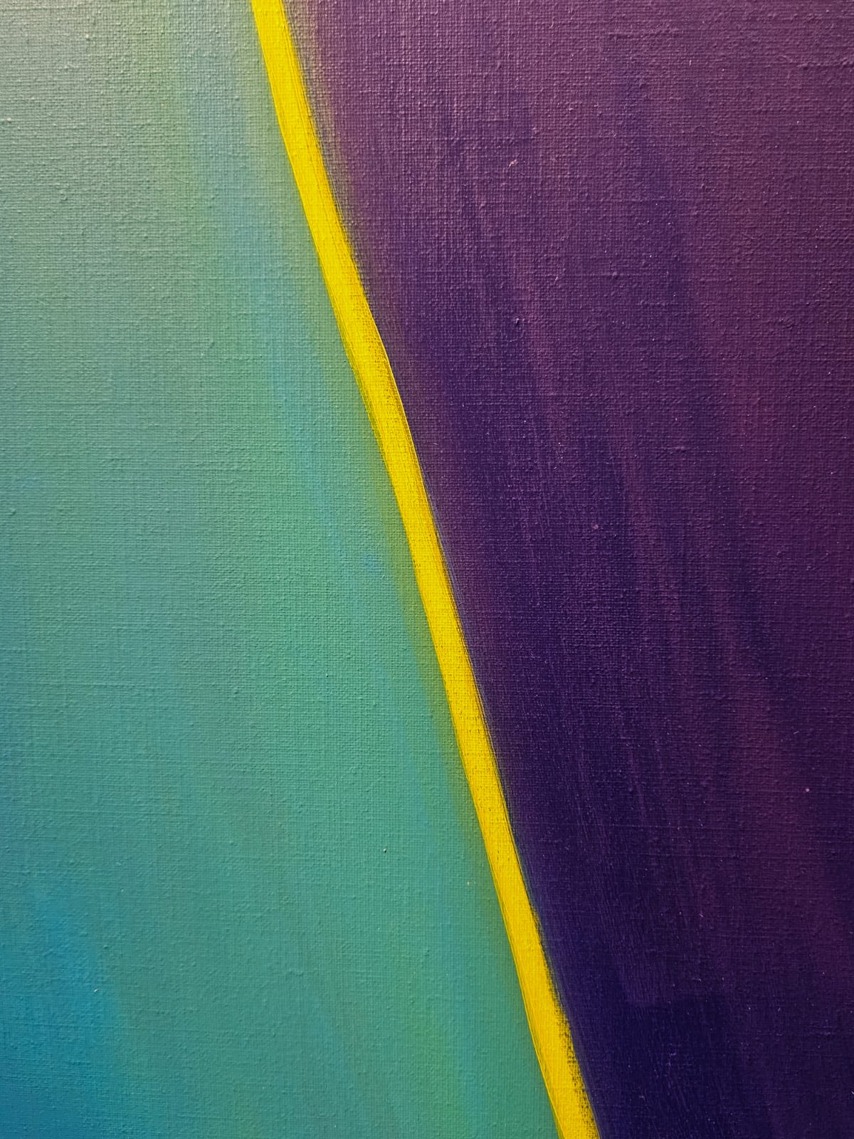 We once again see the significance of colour to Nahappan’s artistic expression. The hues of deep blue and purple are nuanced, rich and almost velvety, reflecting Nahappan’s close friendship with Sabapathy and her consequent understanding of his inner personality. On the other hand, the strips of yellow run steadily and emanate an almost neon glow into the surrounding blue areas. In this we may find vitality and a literal guiding light, perhaps mirroring Sabapathy’s groundbreaking work in the local arts scene over the past 50 years.