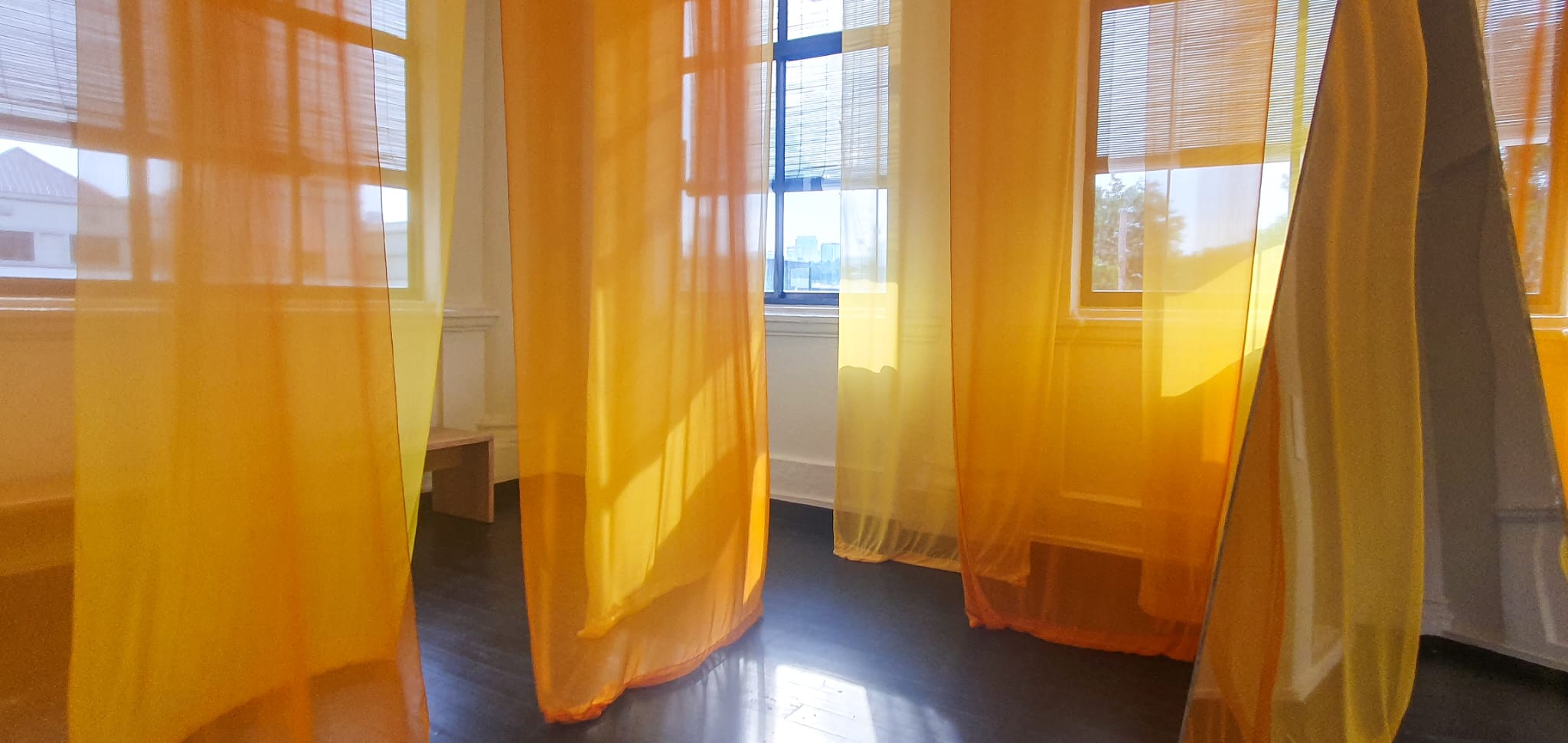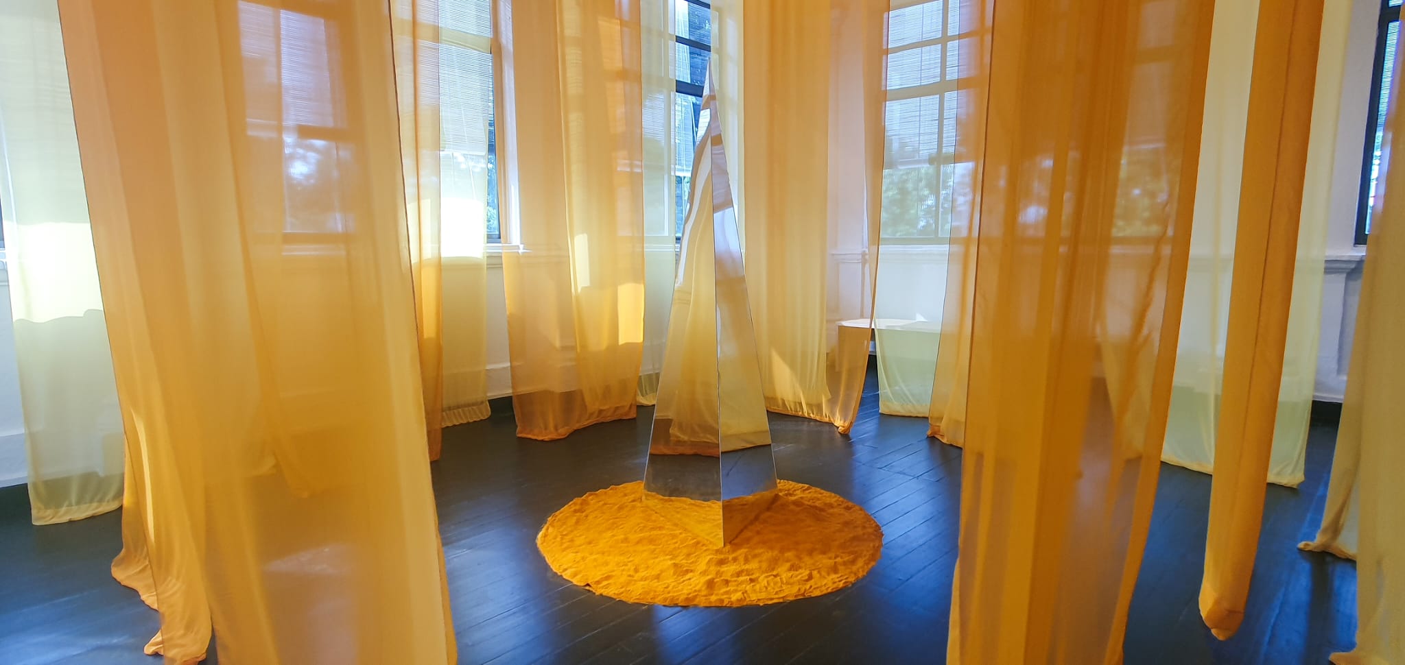 In the same vein, the placement of Monument (1996/2023) finds itself closely tied to weather elements—more specifically, the sun’s pattern of movement. The work, situated in Caroline Verandah, comprises floor-to-ceiling lengths of yellow fabric that congregate around a circular area of turmeric, within which a tall glass pyramid is buried.